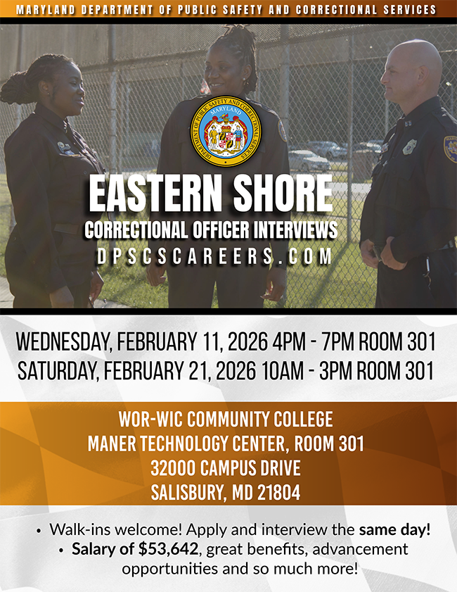 Eastern Shore Correctional Officer Interviews Wor-Wic Community College Maner Technology Center, Room 301 32000 Campus Drive Salisbury, MD 21746 Salary $53,642 Walk-ins welcome! *Click image to enlarge |